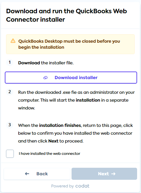 If the user selects "QuickBooks Desktop app" on the initial LinkLink The authorization flow that allows end users to connect their accounting, banking, or commerce platforms to your application via Codat. screen, they will be directed to download the web connector from a Codat LinkLink The authorization flow that allows end users to connect their accounting, banking, or commerce platforms to your application via Codat. URL.