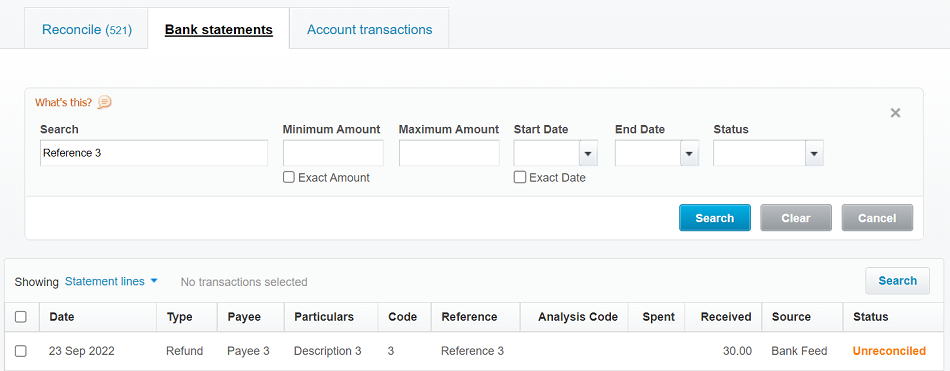 For example, the Statement line below will result in a bank statement line with a counterparty of Payee 3 and a description with the value: Description 3 Reference 3 3.